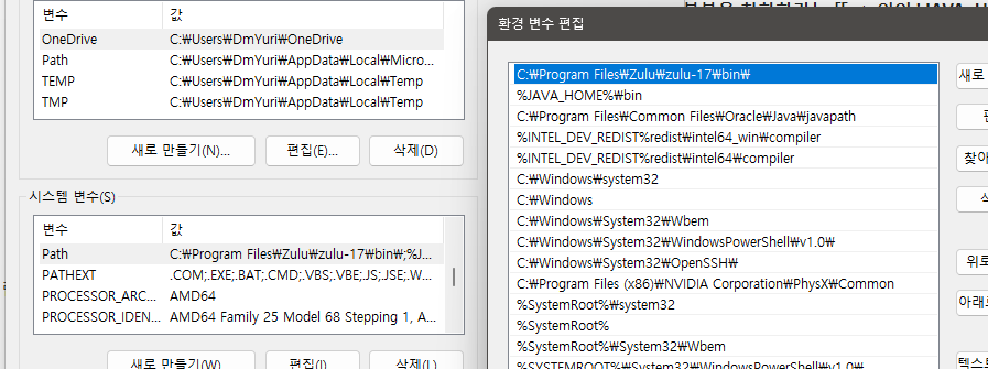 ์์คํ ๊ฒ์ : '์์คํ ํ๊ฒฝ ๋ณ์ ํธ์ง'์ผ๋ก ์ง์ -> ์๋ ์ฌ์ง์ฒ๋ผ path์ ์ค๋ฃจ๊ฐ ์ต์๋จ์ผ๋ก ๋๋์ง ํ์ธ