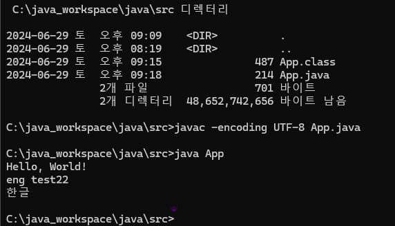 ์ปดํ์ผํ ๋ ' javac -encoding UTF-8 App.java' ๋ผ๊ณ ๊ธฐ๋ณธ์ธ์ฝ๋ฉ์ UTF-8๋ก ๋ณ๊ฒฝํจ