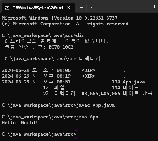 ๋ น์ด๋ฅผ ์ด์ฉํด ์๋ฐ์ ์์คํ์ผ App.java๋ฅผ byte์ฝ๋ (.class ํ์ผ)