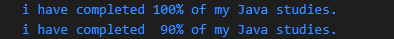 System.out.printf("i have completed %d%% of my %s studies.\n", 100,"Java");