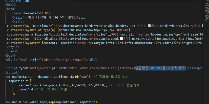 5. JS + html์ ๋ณต์ฌํ๊ณ Vscode์ ๋ถํ๋์ ํ, 3. ์์ ๋ฐ๊ธ๋ฐ์apiํค ๋ฅผ ๋ฃ๊ณ ๋ง์๊ป ์ปค์คํ ํ๋ฉด ๋