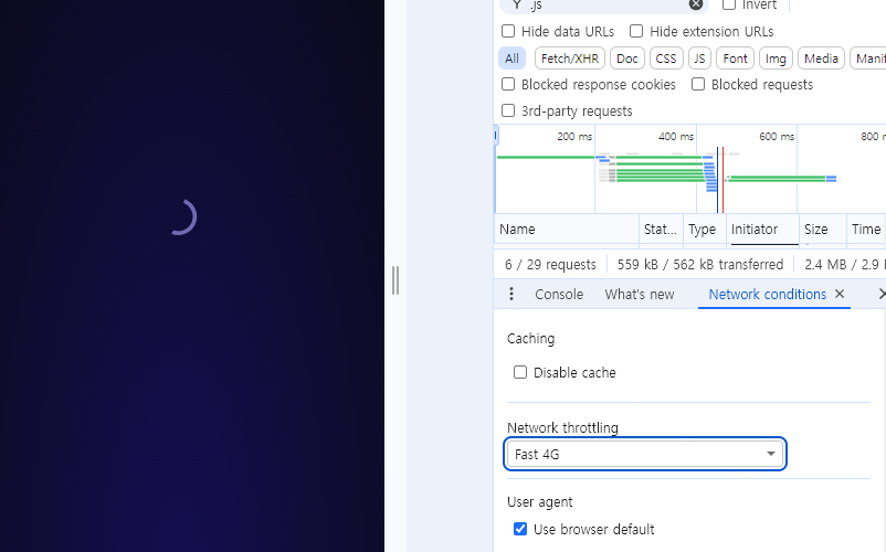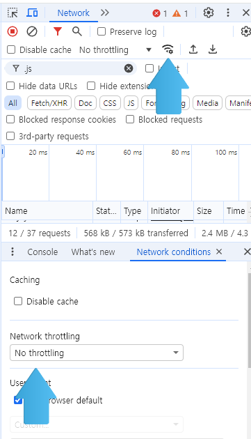 - ๊ฐ๋ฐ์ ๋๊ตฌ (F12) - Network ํญ - ์์ดํ์ด ์์ด์ฝ ํด๋ฆญ - Throttling (์ค๋กํ๋ง) ์ค์ - ์๋ก๊ณ ์นจ