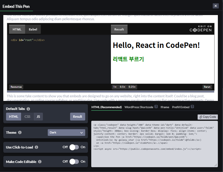 1. 코드펜 오른쪽 하단의 Embed를 클릭