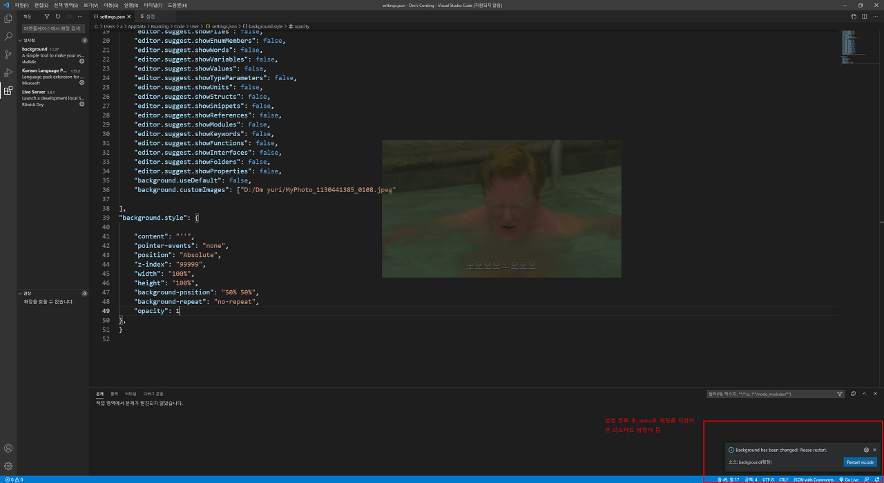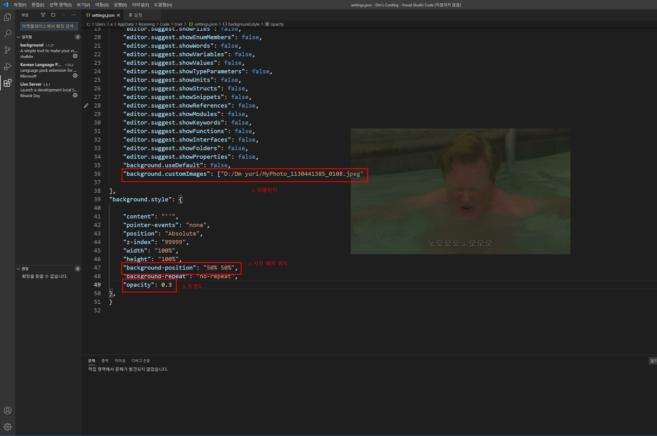 "editor.suggest.showProperties": false, "background.useDefault": false, "background.customImages": [ "D:/Dm yuri/MyPhoto_1130441385_0108.jpeg" ], "background.style": { "content": "''", "pointer-events": "none", "position": "Absolute", "z-index": "99999", "width": "100%", "height": "100%", "background-position": "50% 50%", "background-repeat": "no-repeat", "opacity": 1 },